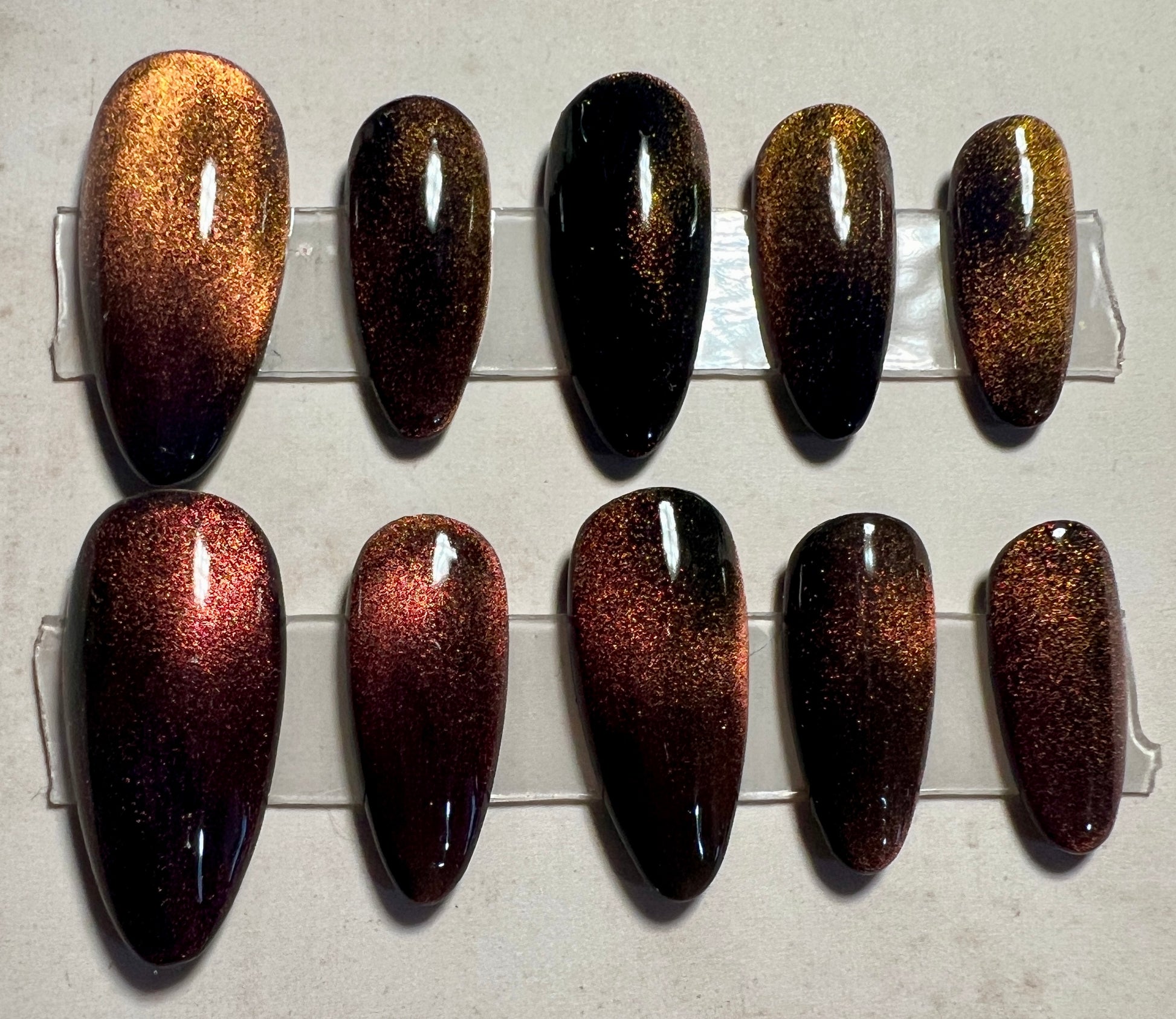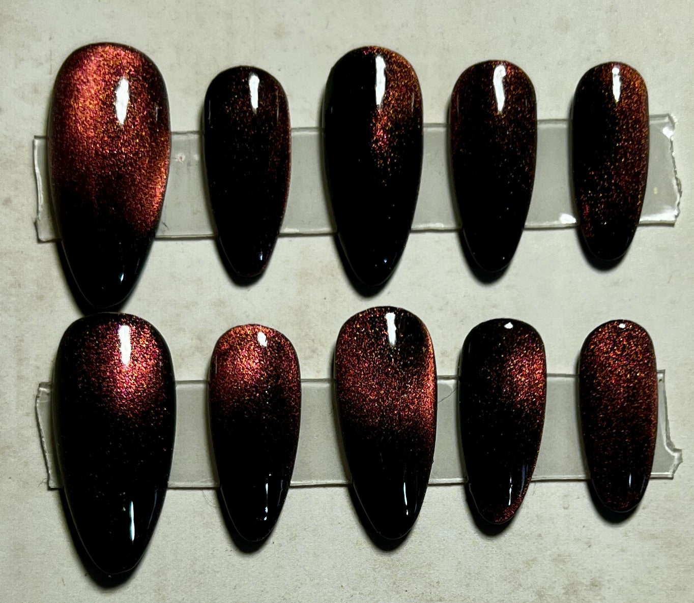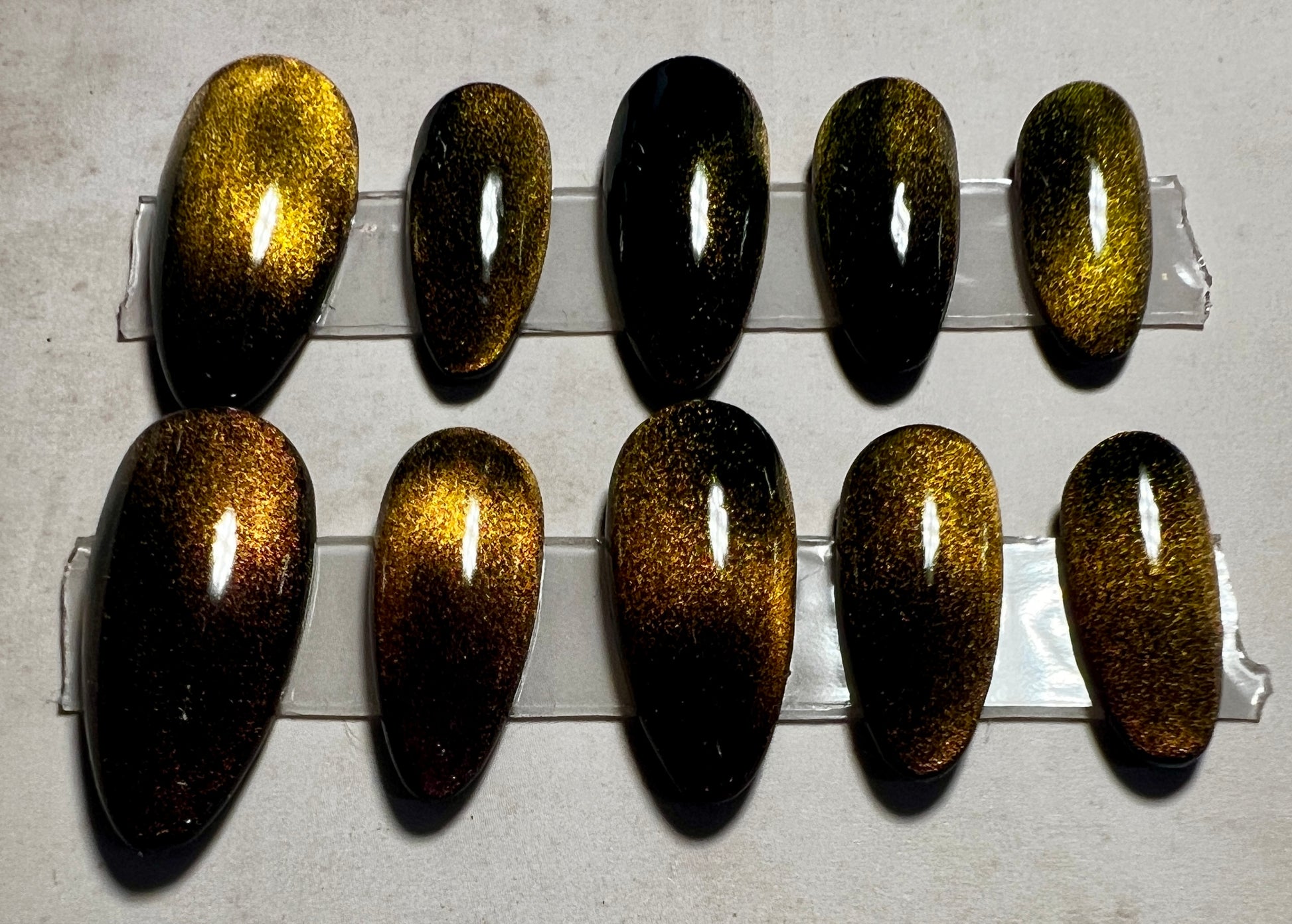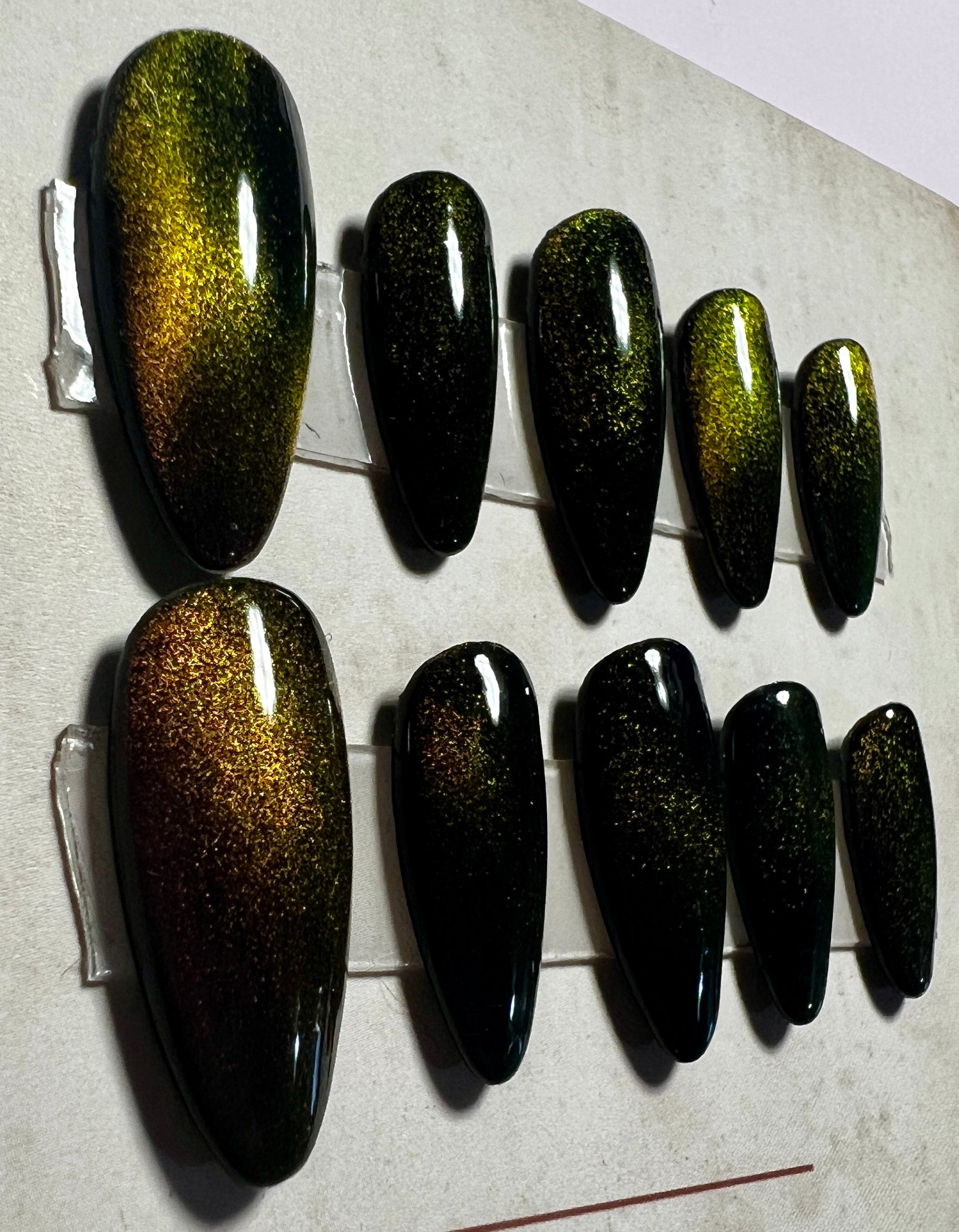 Mystic Eclipse is a shifting cat eye set that dances between deep emerald, golden amber, and hints of rose depending on the light. The magnetic shimmer gives a glowing, eclipse-like effect that feels both mysterious and elegant.